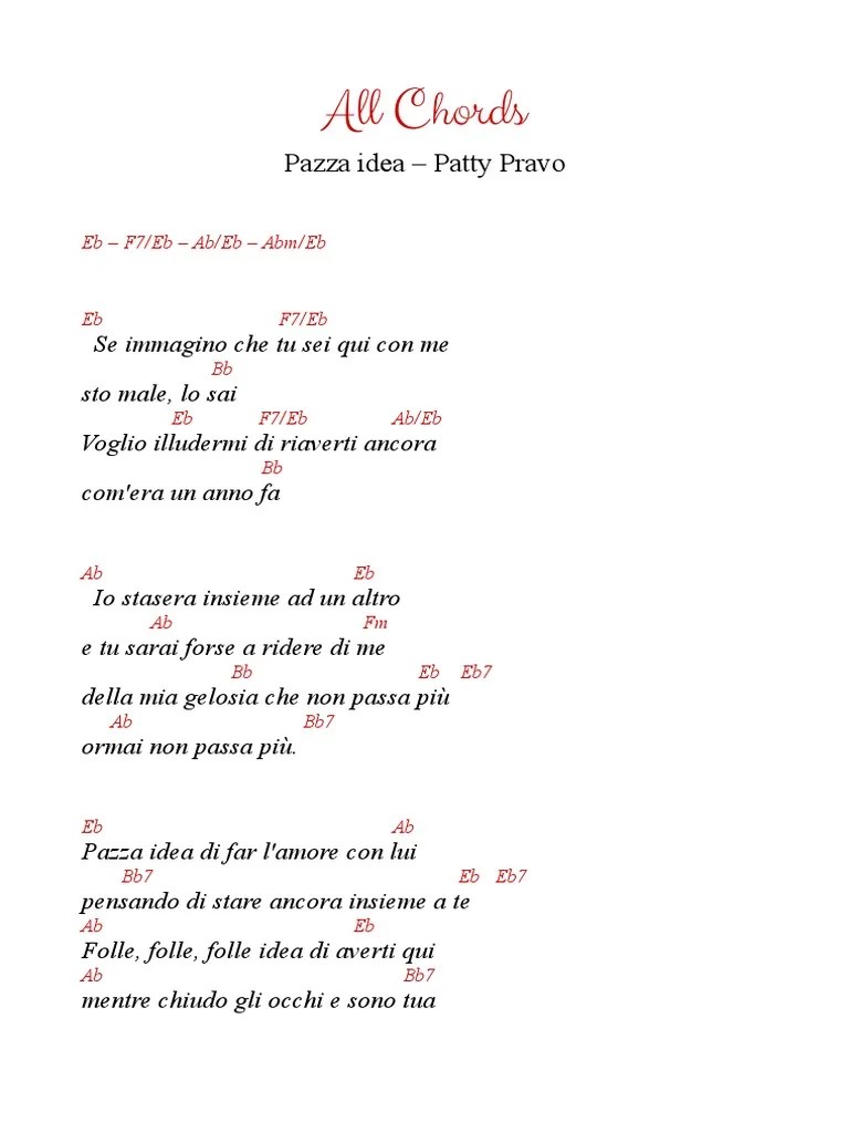 Watch the video for pazza idea from patty pravo's bye bye patty for free, and see the artwork, lyrics and similar artists. Se immagino che tu sei qui con me, sto male, lo sai! Patty pravo pazza idea pas cher ⭐ neuf et occasion ✌ meilleurs prix du web ✓ 3% remboursés minimum sur votre commande ! Patty pravo pazza idea lyrics: Midis101.com, high quality midi songs and files to download, largest midi collection on earth.